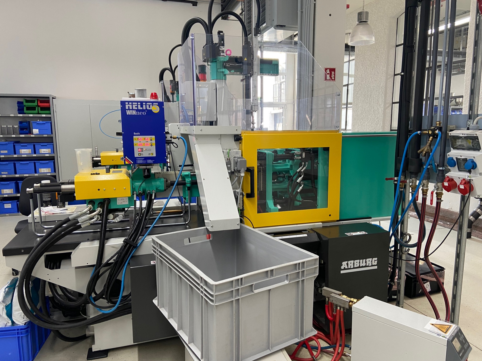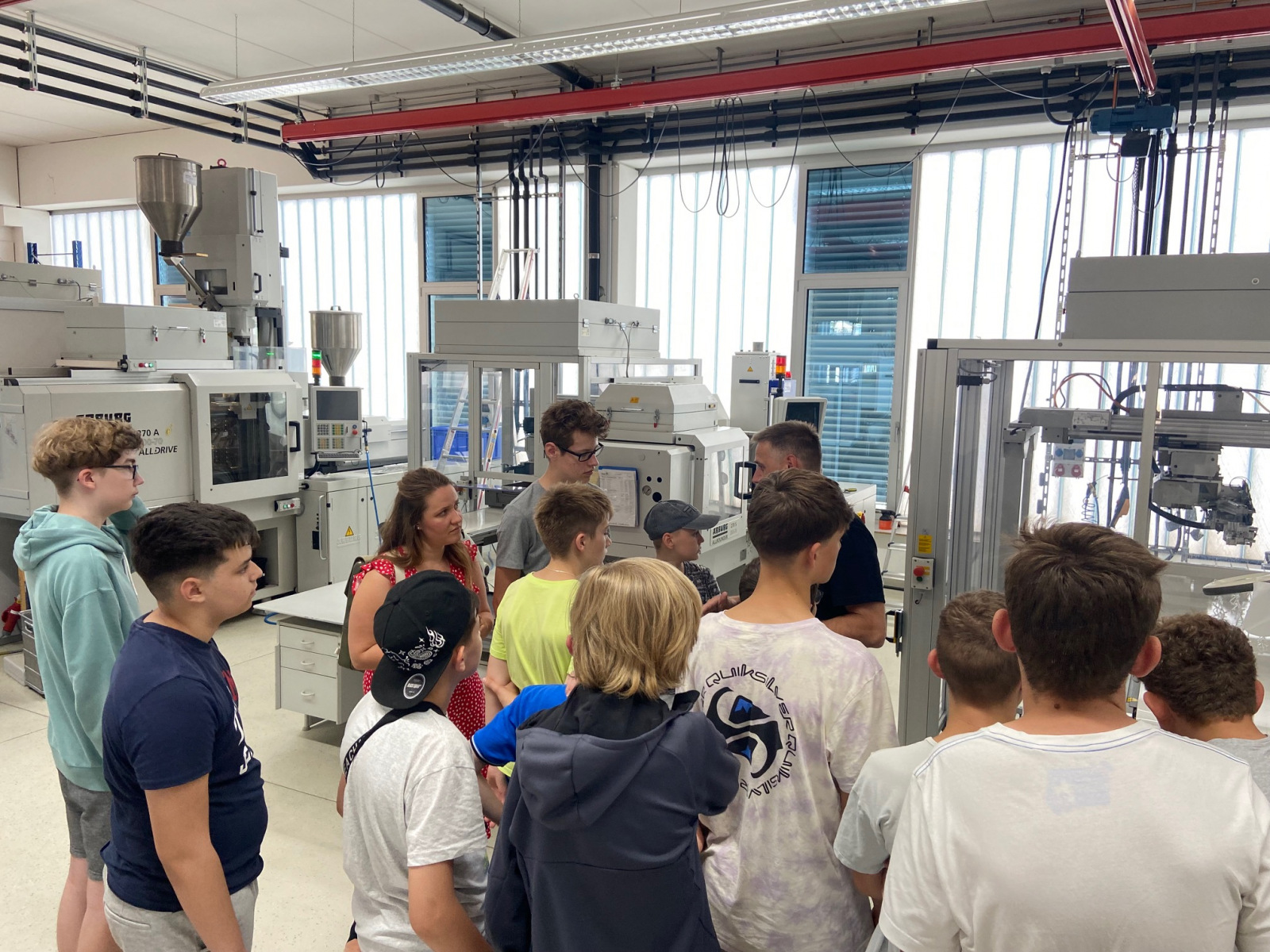 Danach durften wir in die Produktionshalle. Dort sahen wir, wie verschiedene Dinge an den modernen Spritzgussmaschinen gefertigt wurden. Anschließend erhielten wir bei einer Spezi ausführliche Informationen über den Ausbildungsberuf des Verfahrensmechaniker für Kunststofftechnik.